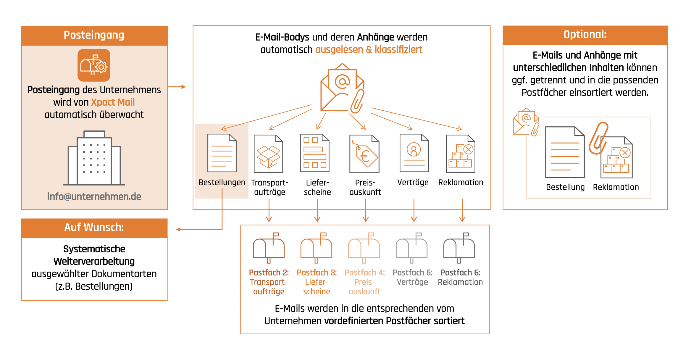 Mit unserer Produktlinie XPACT MAIL ermöglichen wir eine KI-basierte, vollautomatisierte und branchenunabhängige Postfachverwaltung. Mittels unserer selbst entwickelten KI können wir E-Mails samt Anhängen auslesen, klassifizieren und trennen. Die analysierten E-Mails werden gemäß ihres Inhalts in vordefinierte Postfächer einsortiert, können dann von den zuständigen Personen einfach bearbeitet werden.
